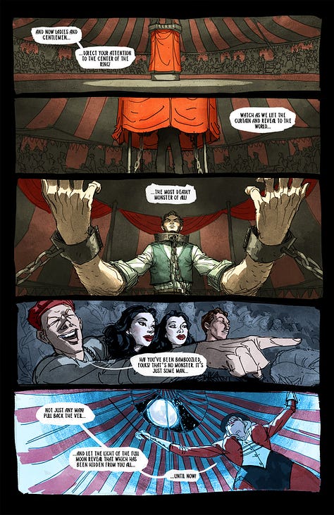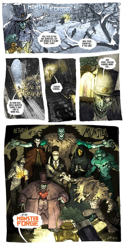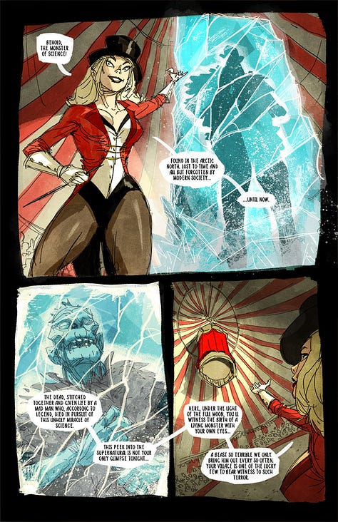 Shannon has teamed up with John Cboins for this project. Return of the Monsters is an original graphic novel that tells the story of what would happen if the monsters from the classic novels teamed up against a greater foe. As we learn about where all the monsters are after the events of their stories, a traveling showman brings them together and sets the stage for something epic. While a bit vague I am all here for it, and John’s art showcases just enough horror and creepiness to sell the premise as you can see below.