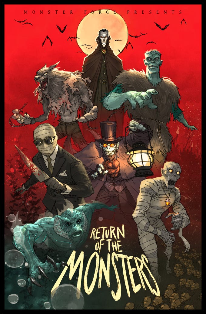 As many of you already know I have a soft spot for the Universal Monsters of old. I’m a bit too young to have enjoyed these characters in their original movies but I grew up with a steady does of Dracula movies, and different iterations of the monsters throughout the years. I made it one of my goals this year to finally sit down and read the original novels that sparked this whole genre of movies and comics. So when I saw people posting about Return of the Monsters I was intrigued based solely on the cover art you see above. Then I dug into the campaign.